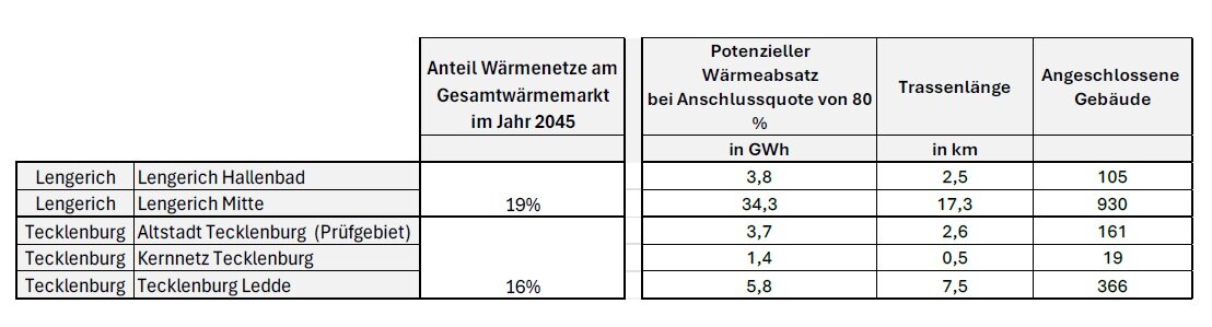 „Die Potential- bzw. Prüfgebiete für Wärmenetze decken in den sieben Kommunen insgesamt einen Anteil von 14 % des zukünftigen Wärmebedarfs ab, allerdings mit unterschiedlichen Potentialen in den einzelnen Kommunen“, fasst Ingo Leufke die Ergebnisse der bisherigen Analysen zusammen. Für Lengerich und Tecklenburg benannten Bürgermeister Möhrke und Bürgermeister Streit die potentiellen Wärmenetzgebiete. In Lengerich werden die Gebiete rund um das Hallenbad und ein Gebiet in der Lengericher Innenstadt weiter auf die Machbarkeit untersucht. Insgesamt könnten dann über 1000 Gebäude an ein bestehendes Nahwärmenetz angeschlossen werden. In Tecklenburg wird sich die Stadt weiter mit einem möglichen Wärmenetz in der Tecklenburger Altstadt beschäftigen, da hier die technische Machbarkeit von einzelnen Luft-Wärmepumpen aufgrund des Denkmalschutzes eingeschränkt ist. Ausserdem gibt es ein direkt angrenzendes Kerngebiet rund um das Rathaus, die Schulen und das Amtsgericht, sowie ein Potentialgebiet im Ortsteil Ledde, das derzeit von einem Biogasbetreiber auf die Machbarkeit untersucht wird. Das Potential in Tecklenburg umfasst dann insgesamt knapp 550 Gebäude, die zukünftig Anschluss an Wärmenetze finden könnten.