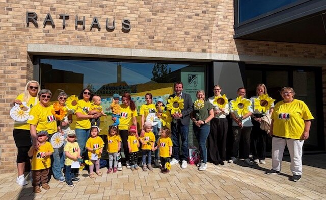 Schon von weitem fiel die fröhliche Gruppe auf dem Rathausplatz ins Auge: Alle Kinder und Tagesmütter waren in gelbe T-Shirts gekleidet und trugen eine selbstgebastelte Sonnenblume in der Hand.