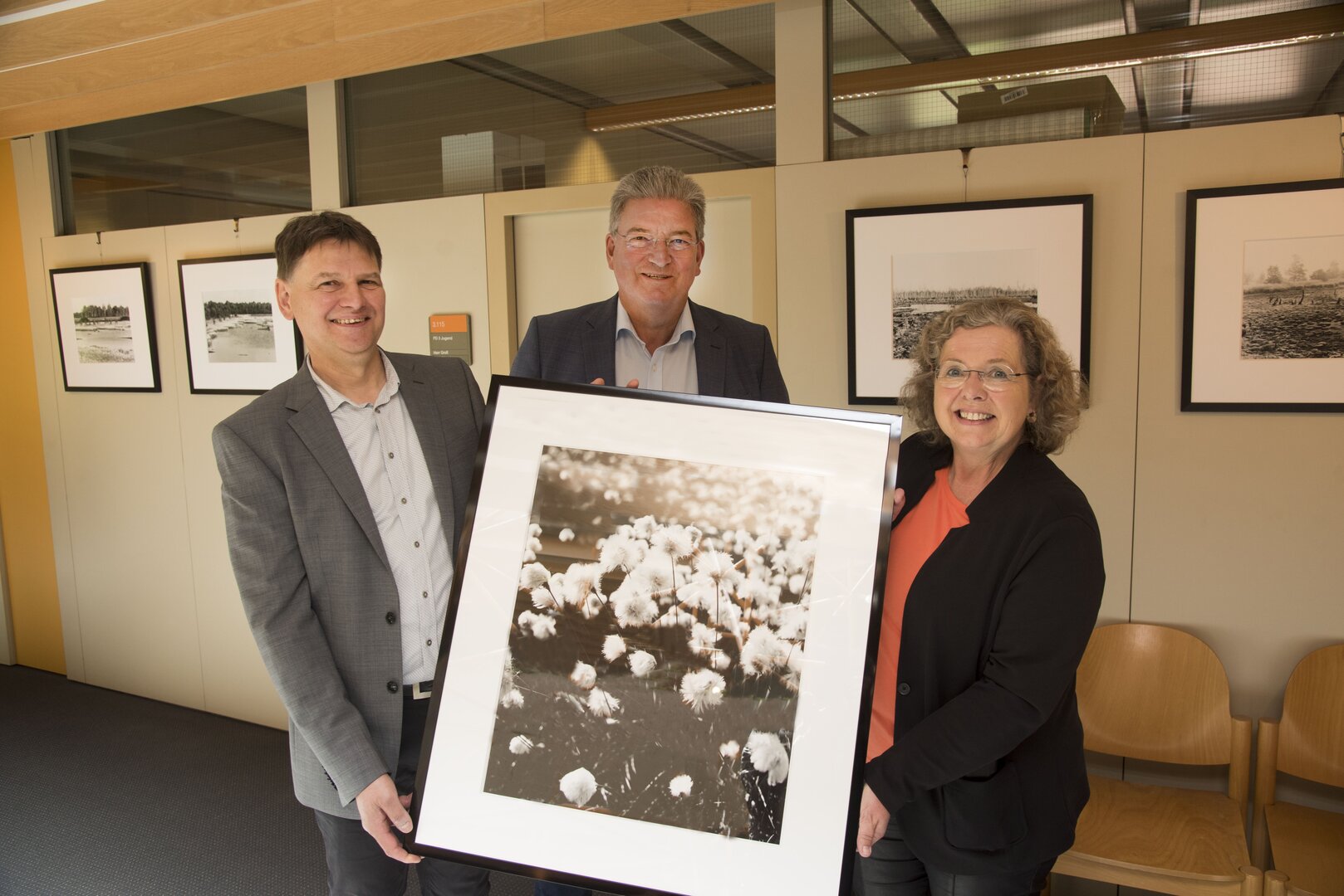 Das Ende eines Moores, dessen Entstehung vor 6000 Jahre begann und den Neubeginn, der mit der Wiedervernässung einsetzt - dieses Wechselspiel zwischen Ende und Neuanfang wird in den hier präsentierten Bildern gezeigt. Kreisrat Matthias Selle betonte zur Eröffnung der Ausstellung: „Durch die Reduzierung der Farbe auf Graustufen werden die einzelnen Objekte noch einmal mehr in den Vordergrund gestellt“.