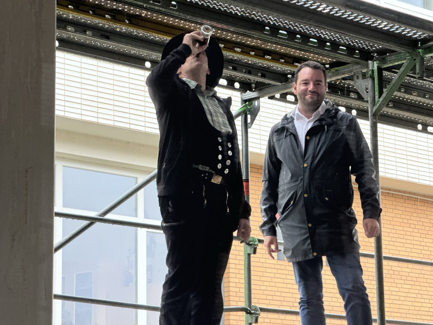 Mit dem Richtspruch und dem symbolischen Anbringen des Richtkranzes wurde die nächste Etappe auf dem Weg zur Fertigstellung der Schulmensa feierlich abgeschlossen. Der Bau schreitet weiterhin planmäßig voran, sodass die Inbetriebnahme für das kommende Schuljahr erwartet wird.