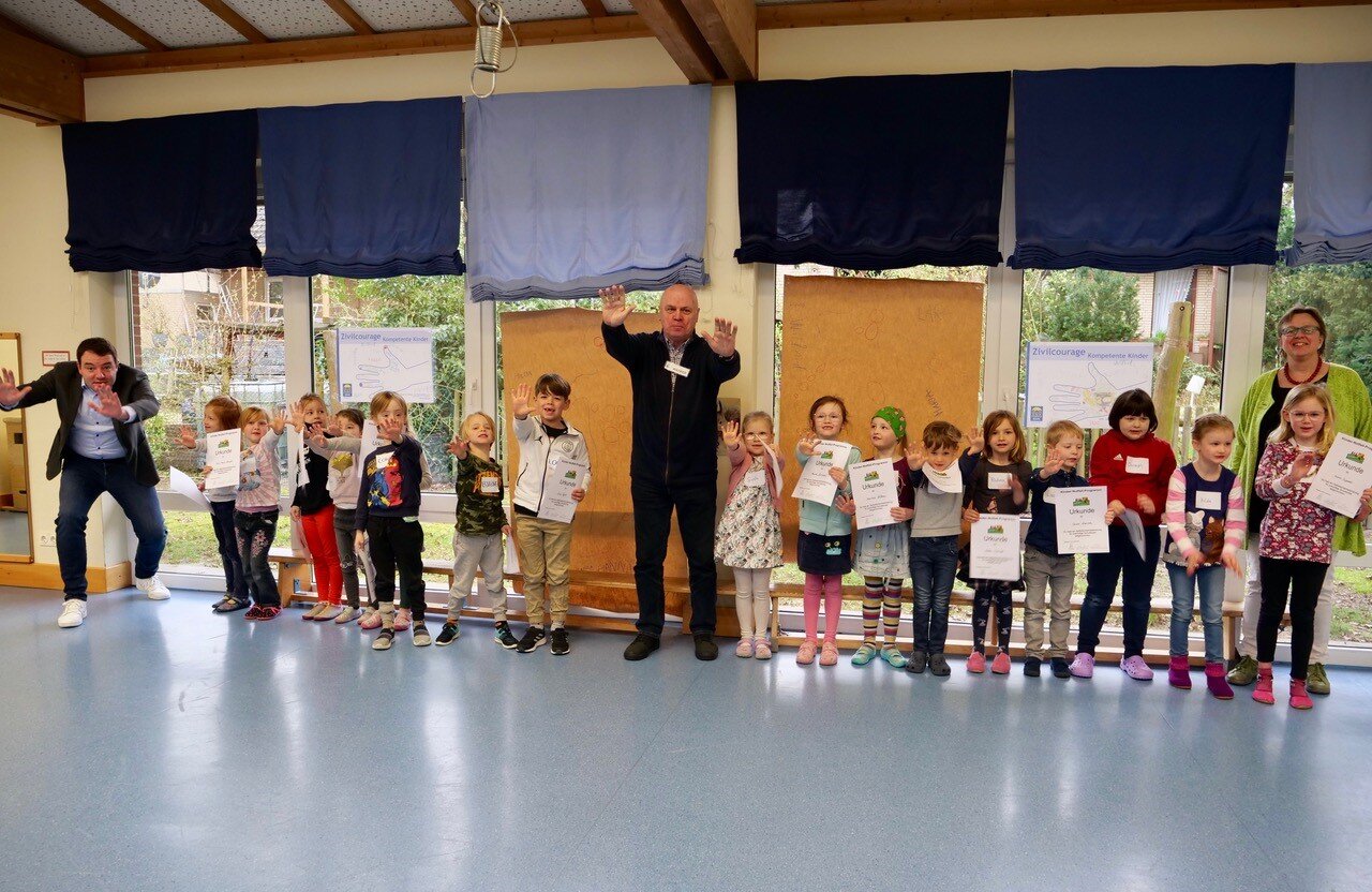 Seit 2015 setzt die Gemeinde Hasbergen in Schulen und Kindertagesstätten auf verhaltensorientierte Prävention, damit Kinder sich im Notfall zur Wehr setzen können. Auch in diesem Jahr erhielten zahlreiche Vorschulkinder eine Urkunde, sowie die eigens kreierte Kinder-Notfall-Karte.