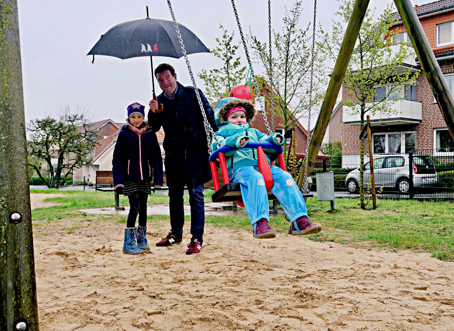 Und so weihte Schäfer Ende April, trotz kalten Wetters und Dauerregens, zusammen mit Frederica Zappe und deren kleiner Schwester am Spielplatz Höhenholz den ersten blauroten Schaukelsitz für Kleinkinder ein. Bauhofmitarbeiter hatten ihn wenige Minuten zuvor fachgerecht montiertet.