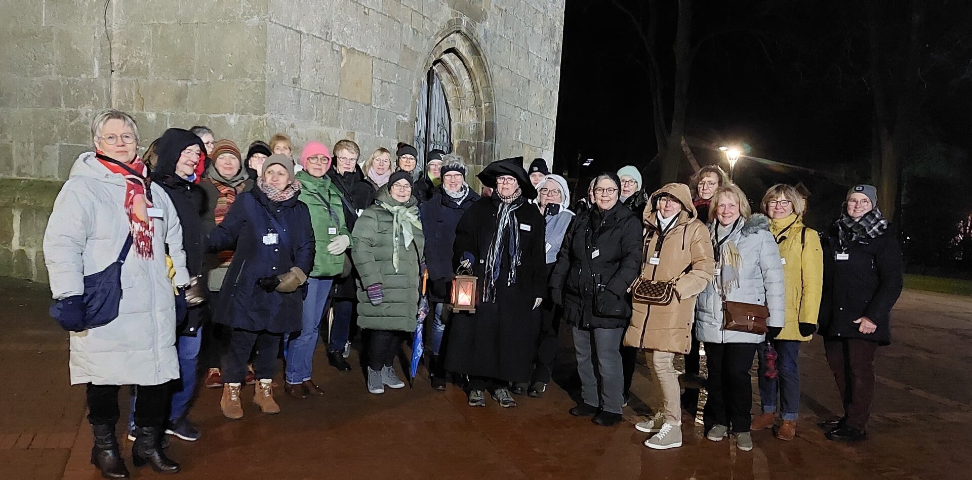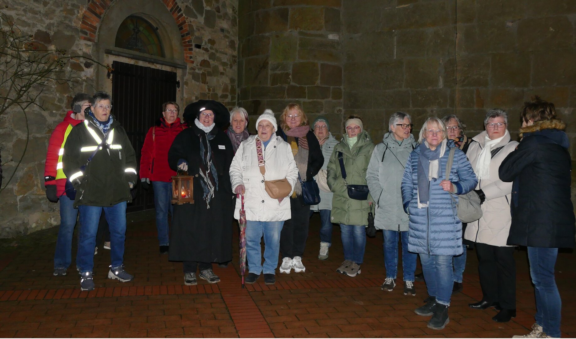 Doch bevor der Rundgang begann bekam jeder ein Namensschild und wenn dieser während des Rundgangs in den Geschichten erwähnt wurde gab es eine kleine Belohnung in Form von „echten Hagener Kirschen“. Nun ging es vom Kirchplatz in die Dorfstrasse über den Gibbenhoff zum Dorfbrunnen zu den Ferkeln an der Alten Straße und weiter zur Hüttenstraße zum Hubert. Von dort führte Winter die Landfrauen weiter Richtung Pilgerweg und durch ein kleines Pättchen Richtung St. Martinus Schule. An der Kirschvilla und an der Sparkasse wurde nochmals ein kleiner Halt eingelegt um dann zurück zur alten Kirche. zu gehen. Dort wo ein kleiner Halt eingelegt wurde erzählte Elke Winter mit Spaß und Leidenschaft Sagen, Anekdoten, Geschichten sowie wahre Begebenheiten aus der Hagener Chronik . Auf den Gibbenhoff erfuhren die Landfrauen über einen großen Brand dem ein großer Bauernhof zum Opfer fiel.,Am Posthorn erzählte sie vom schwarzen Hund in dem der Teufel saß .Dieser wurde von den damaligen Pfarrer in einer Figur im Giebel verbannt, wo er noch heute sein soll.Außerdem gab es noch was zu hören von einer versunken Kirche am Mehrpol oder vom Werwolf aus der Niedermark. Dieses sind nur ein paar von den Geschichten die Winter erzählte. Alle Landfrauen fanden den Abend sehr kurzweilig, spannend und gleichzeitig informativ. Nach den Rundgang durfte auch der gemütliche Teil nicht fehlen . Im Beckmanns gab es noch eine hausgemachte Gulaschsuppe die nach diesem Gang sehr gut tat und aufwärmte. Da das Interesse so groß war wurde der schaurige Rundgang gleich an zwei Terminen (22. Januar und 29 Januar) durchgeführt.