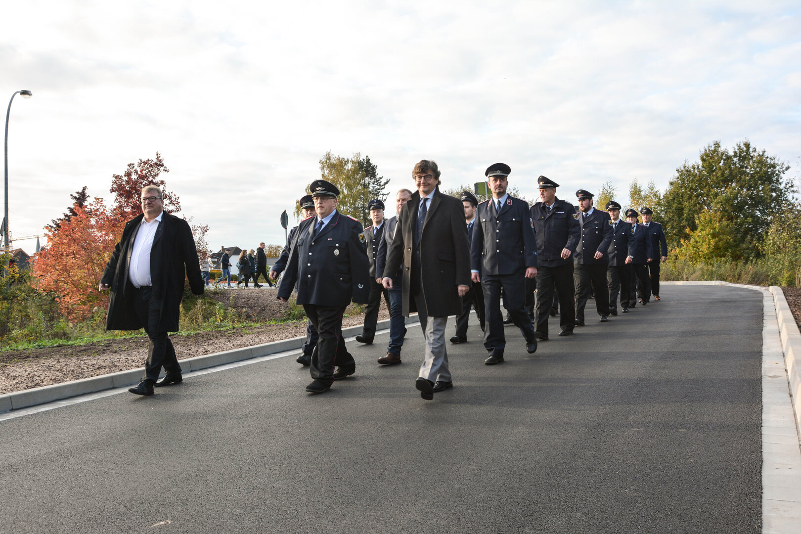 Hierzu trafen sich am Nachmittag alle Kameraden der Feuerwehr Hasbergen, die Jugendfeuerwehr, die Altersabteilung, der Feuerwehrausschuss, das DRK Hasbergen sowie der Rat und die Verwaltung und Freunde der Feuerwehr Hasbergen am alten Gerätehaus. Von hier aus startete man, in musikalischer Begleitung der Musikkapelle Hagen, den gemeinsamen, feierlichen Marsch zum neuen Standort der Feuerwehr Hasbergen, wo sich alle Mitglieder und Gäste (unter Einhaltung der 2G-Regelung) in der neuen Fahrzeughalle versammelten.