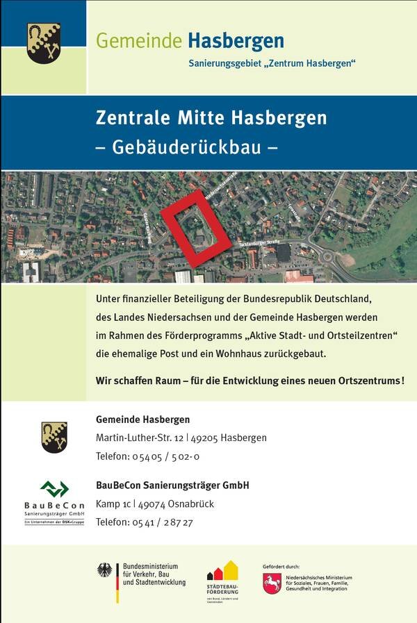 Das Niedersächsische Ministerium für Soziales, Frauen, Familie und Gesundheit gibt bekannt, dass die Gemeinde Hasbergen in das Städtebauförderungsprogramm "Aktive Stadt- und Ortsteilzentren" aufgenommen wurde und im Jahr 2008 mit 616.600 Euro gefördert wird.